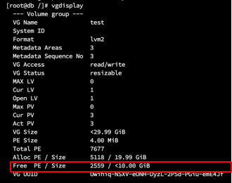 - 명령어3 : lvextend /dev/test(vg이름)/lvs(lv이름) -l +2559