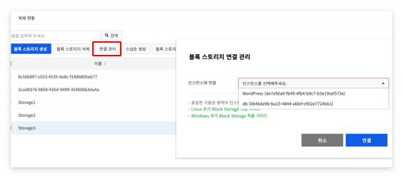 - 연결 관리 클릭 -> 스토리지 추가 대상 인스턴스 선택