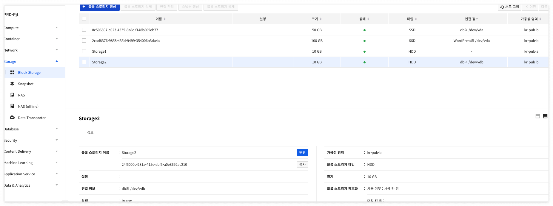 - NHN 콘솔에서 Storage -> Block Storage로 이동하면 현재 내가 가지고 있는 프로젝트 내 블록 스토리지 리스트 확인 가능.