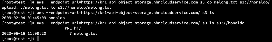 aws --endpoint-url=https://kr1-api-object-storage.nhncloudservice.com s3 cp melong.txt s3://honaldo