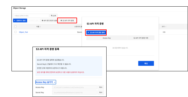 - 아래 그림에서 S3 API 자격 증명 -> S3 API 자격 증명 등록 -> Access Key / Secret Key 복사하여 메모장에 적습니다. 창을 그냥 닫으면 Secret Key는 다시 확인할 수 없다네요