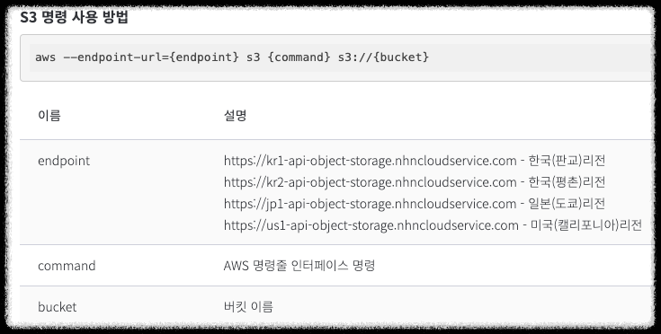 aws --endpoint--url=https://kr1-api-object-storage.nhncloudservice.com s3 ls